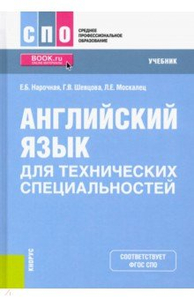 Английский язык для технических специальностей. Учебник  Авторы: Нарочная Елена Борисовна, Москалец Лариса Евгеньевна, Шевцова Галина Васильевна Издательство: Кнорус Английский язык для технических специальностей. Учебник "Согласно общеевропейской шкале языковой компетенции данный учебник соответствует уровню В1. Основная цель — сформировать компенсаторные умения общения на основе повседневных, общетехнических и общепрофессиональных тем, а также сформировать устойчивую мотивацию к изучению иностранного языка. Для реализации данной цели включены тексты социально-культурного, научно-популярного и общепрофессионального характера. Все тексты являются образцами современной английской речи, разнообразны по стилю и содержащейся в них информации. Работа с текстом направлена на подготовку к освоению информации различной тематики для реферирования и дальнейшего обсуждения. Учебник рассчитан на 170 часов аудиторных занятий и внеаудиторной самостоятельной работы студентов.
