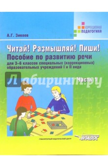 Авторы: Зикеев Анатолий Георгиевич Издательство: Владос Читай! Размышляй! Пиши! 3-6 классы. Ч. 1. Пособие по развитию речи для специальных образовательных учреждений" В пособии решаются пропедевтические и контрольные задачи первоначального знакомства с наиболее употребительными союзами, понимании и реализации в собственной речи союзных конструкций. Занятия по развитию речи имеют практическую направленность.