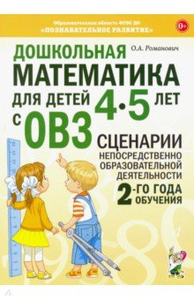 Дошкольная математика для детей 4–5 лет с ОВЗ. Сценарии непосредственной образовательной деят.    Авторы: Романович Олеся Анатольевна  Издательство: Гном  Дошкольная математика для детей 4–5 лет с ОВЗ. Сценарии непосредственной образовательной деят.  "Автором представлено перспективное планирование непосредственно-образовательной деятельности (НОД) и конспекты занятий по ФЭМП в средней группе для детей с ограниченными возможностями здоровья (ОВЗ). Систематическая работа по пособию способствует повышению эффективности образовательной деятельности по формированию математических знаний, познавательному и речевому развитию дошкольников массовых и коррекционных групп детских садов.