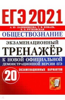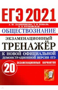 ЕГЭ-2021. Обществознание. Экзаменационный тренажер. 20 вариантов  Авторы: Лазебникова Анна Юрьевна, Рутковская Елена Лазаревна, Коваль Татьяна Викторовна Издательство: Экзамен ЕГЭ-2021. Обществознание. Экзаменационный тренажер. 20 вариантов "Экзаменационный тренажёр включает 20 тренировочных экзаменационных вариантов по обществознанию, которые составлены с учетом особенностей и требований Единого государственного экзамена по обществознанию в 2021 году. Ко всем заданиям даны ответы и подробные критерии оценивания заданий части 2.