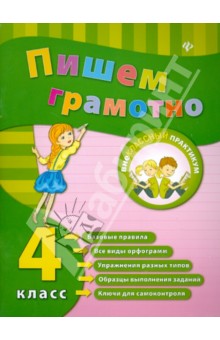 Пишем грамотно. 4 класс  Авторы: Сучкова Инна Юрьевна Издательство: Феникс Пишем грамотно. 4 класс "Данное практическое пособие охватывает все темы, которые предусмотрены программой по русскому языку и знание которых необходимо для развития навыков грамотного письма. Книга разделена на блоки, каждый из которых содержит основные правила, примеры выполненных заданий и тренировочные упражнения. В пособии также имеются ключи ко всем заданиям.