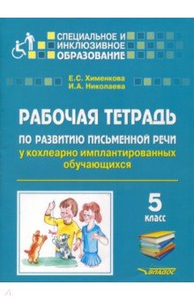 Рабочая тетрадь по развитию письменной речи у кохлеарно имплантированных обучающихся. 5 класс  Авторы: Хименкова Елена Сергеевна, Николаева Ирина Александровна Издательство: Владос Рабочая тетрадь по развитию письменной речи у кохлеарно имплантированных обучающихся. 5 класс "В рабочую тетрадь для 5 класса включены тексты для кохлеарно имплантированных обучающихся для прочтения их на занятиях по русскому языку. Занятия построены в соответствии с ""Примерным годовым тематическим планом индивидуальных занятий по развитию речевого слуха и письменной речи"", приведенном в отдельном методическом пособии.