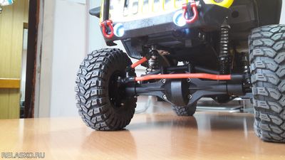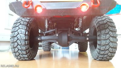 Спереди и сзади установлены и светятся фары. Установлены хорошие тюнинговые амортизаторы. Стоят мощные Ц-хабы и поворотные кулаки от Axial Wraith
