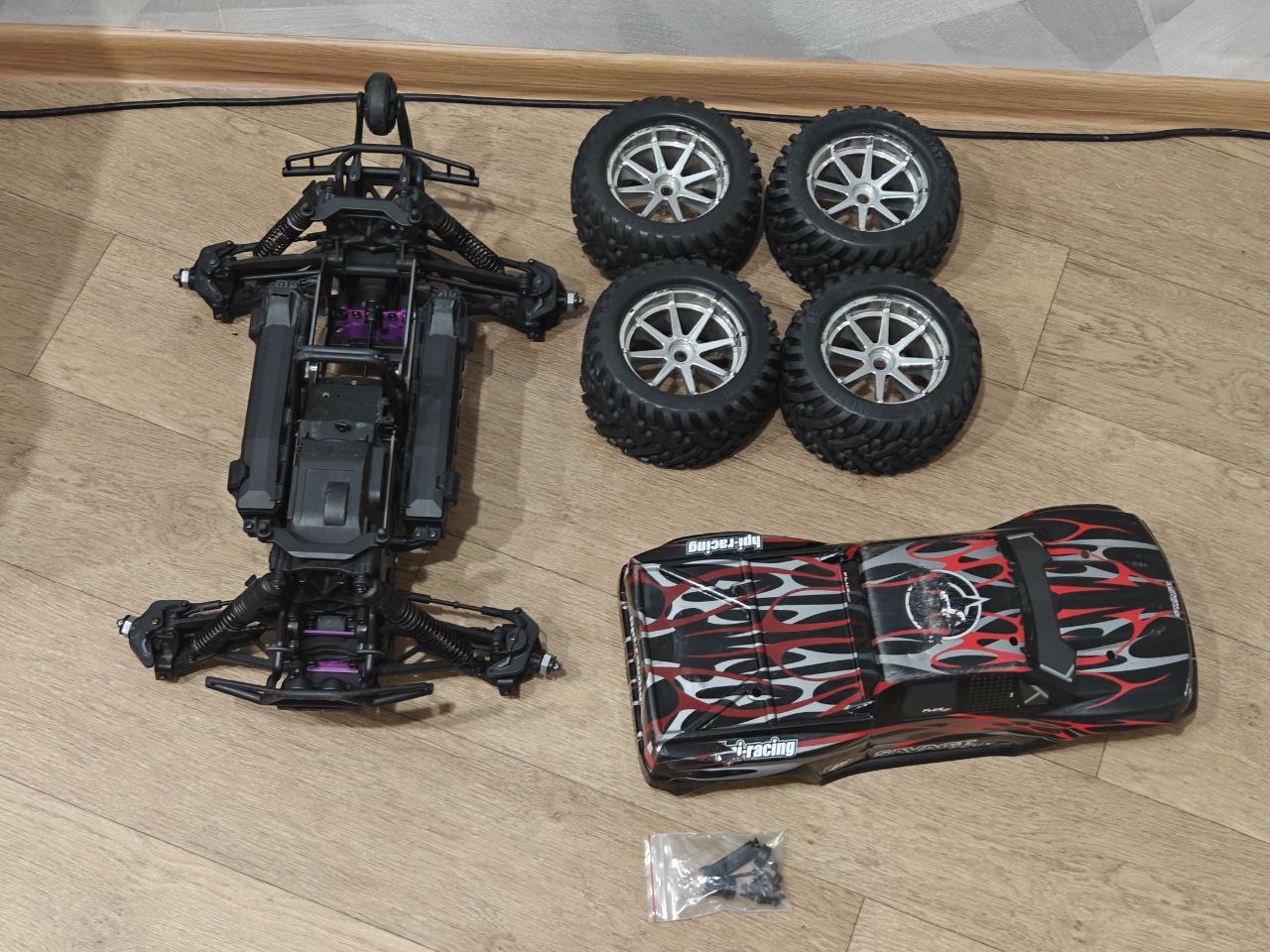 Продаю Hpi Savage HP Flux шасси без электроники Из тюнинга стоит кастомная моторама для центрального дифференциала и сам центральный дифференциал от rcawd arrma 6s. Состояние хорошее на чашках практически нет износа, все крутится свободно, но есть пара незначительных нюансов: один родной штифт верхнего рычага был утерян, на замену поставили сверло. В крышках боксов АКБ были немного варварски расширены выходы, и также бокс приемника был подвержен переделке для крепления регулятора, в переднюю гп попало чуть чуть песка и по итогу верхнее покрытие было подтерто(отдам за доп небольшую плату новые 2 косозубые пары, только придут через неделю) Одно ушко заднего кулака было оторвано, перевернули и поставили на противоположное ухо. Также по шасси желательно залить амортизаторы вместе с осевыми дифференциалами. Колеса Hpi Goliath Вообщем все остальное видно на фото.