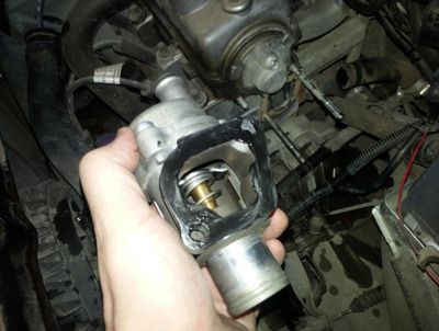 4. Демонтаж термостата 1. Снимите хомуты и отсоедините все шланги от термостата (их 3 или 4 в зависимости от модификации). Из них выльется еще немного антифриза — подложите тряпку. 2. Отсоедините разъем датчика температуры охлаждающей жидкости (он вкручен в термостат). 3. Ключом на 13 (лучше головкой с удлинителем) открутите 3 болта крепления термостата к блоку. 4. Аккуратно снимите термостат. Если прикипел — слегка постучите по нему.