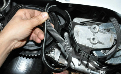 2. Снятие ремня 1. Снимите ремень со шкива генератора, затем с ролика и шкива коленвала. 2. Вытащите ремень через верх или низ. 3. Важно: Пока ремень снят, покрутите рукой натяжной ролик и шкив генератора. Они должны вращаться бесшумно, без люфта и «подклинивания». Если ролик шумит — замените его сейчас, иначе новый ремень долго не прослужит.