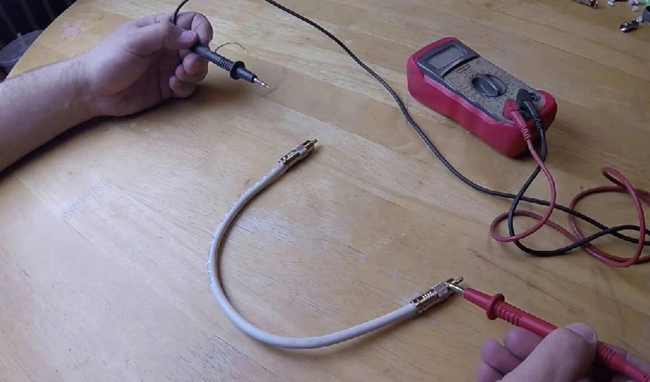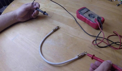 3. Прикоснитесь одним щупом к центральной жиле, а другим — к металлической оплетке (резьбе штекера).