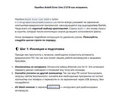 Вы столкнулись с ошибкой AutoIt Error Line 21219 с указанием пути C:\ProgramData\RealtekHD\taskhost.exe? Ваш компьютер внезапно тормозит, греется, а антивирус ничего не находит?