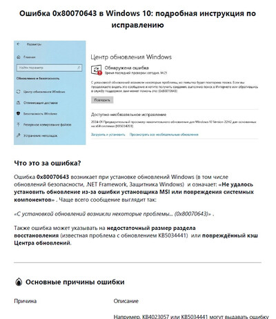 Знакомое сообщение? Вы пытаетесь установить очередное обновление Windows 10, а оно упорно выдаёт ошибку 0x80070643 и не устанавливается. Вы не одиноки — эта проблема затрагивает тысячи пользователей, особенно при установке накопительных обновлений и обновлений безопасности.