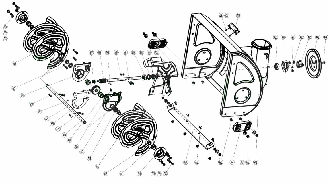 Этап 2: Извлечение шнекового вала из ковша 1. Снятие шкива: Открутите болт крепления большого шкива привода шнека (который находится на задней стенке ковша) и снимите шкив. 2. Боковые крепления: По бокам ковша снаружи открутите болты, удерживающие подшипники вала шнека (ступицы). 3. Выемка узла: Теперь весь узел (вал, редуктор, крыльчатка выброса и сами шнеки) можно вытащить из ковша вперед.