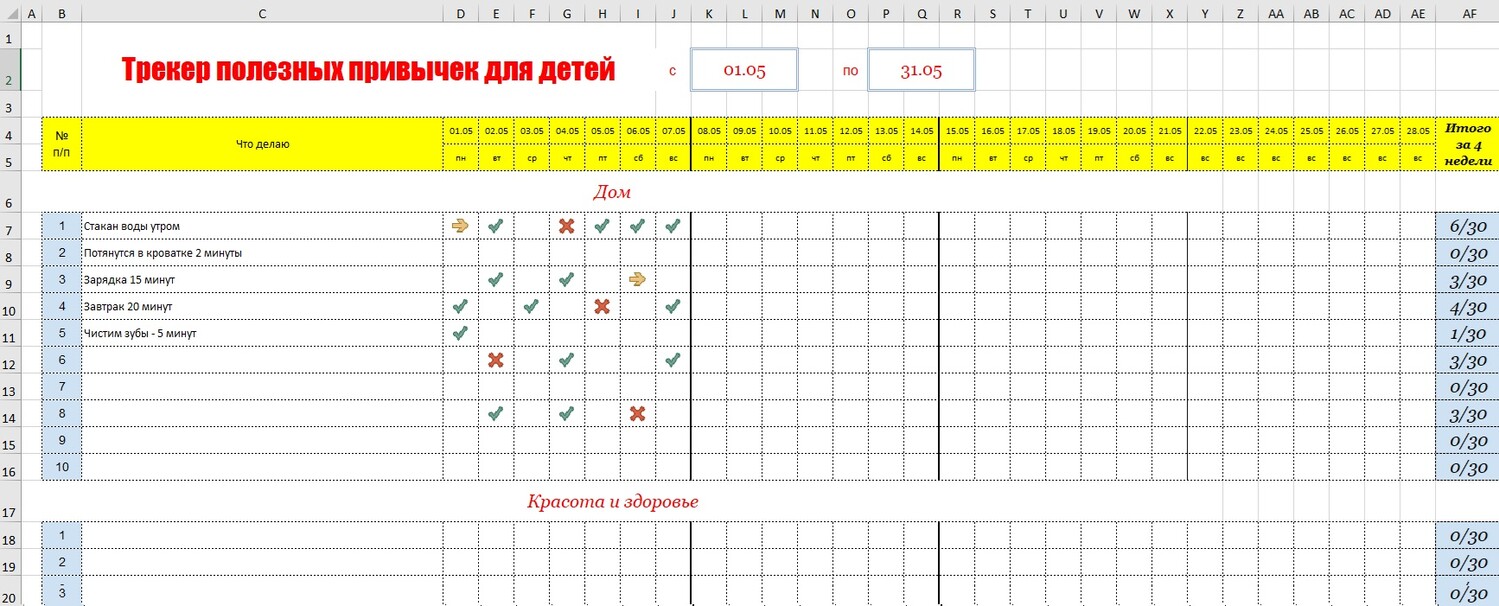 | Трекер полезных привычек для детей - шаблон таблица с примерами на каждый день и месяц скачать Excel / Эксель и распечатать