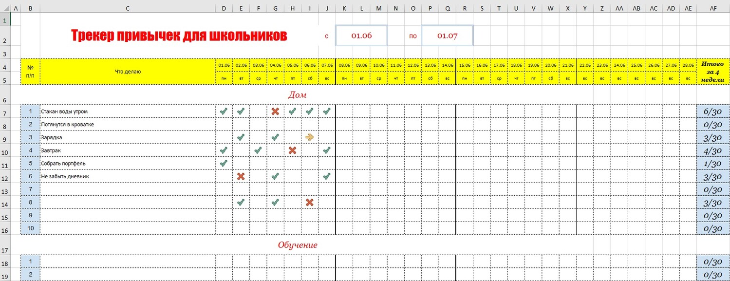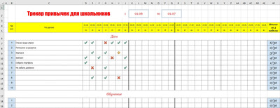 | Трекер привычек для школьников - шаблон таблица с примерами на каждый день и месяц скачать Excel / Эксель и распечатать