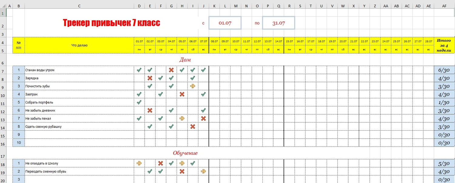| Трекер привычек 7 класс - шаблон таблица с примерами на каждый день и месяц скачать Excel / Эксель и распечатать бесплатно
