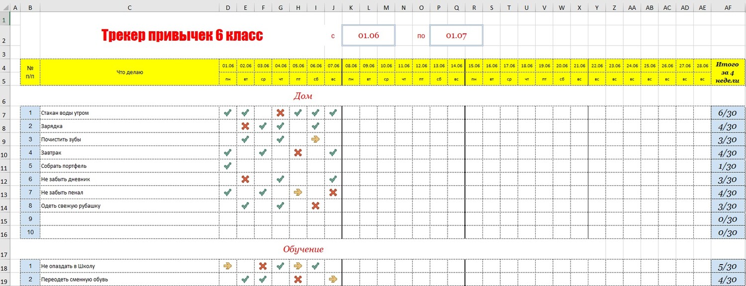 | Трекер привычек 6 класс - шаблон таблица с примерами на каждый день и месяц скачать Excel / Эксель и распечатать
