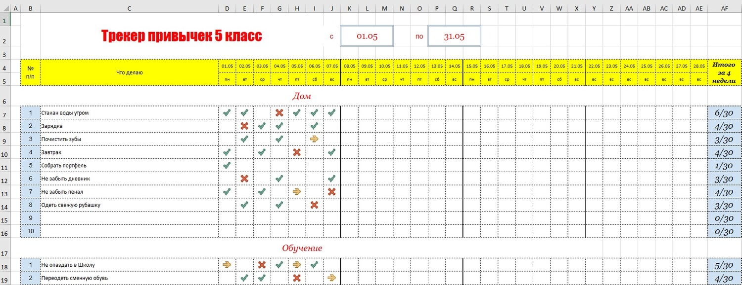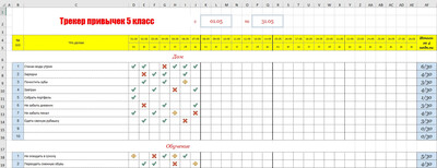 | Трекер привычек 5 класс - шаблон таблица с примерами на каждый день и месяц скачать Excel / Эксель и распечатать