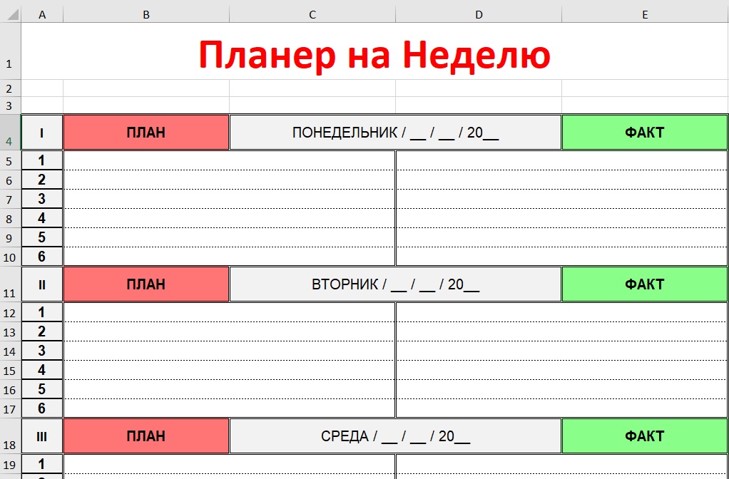Планер на неделю Excel | Ежедневник с разделением ПЛАН / ФАКТ | 7 дней | Скачать и распечатать А4