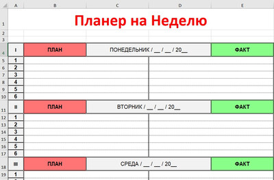 | Планер на Неделю - шаблон таблица на каждый день в формате Excel / Эксель 2026, скачать бесплатно и распечатать А4