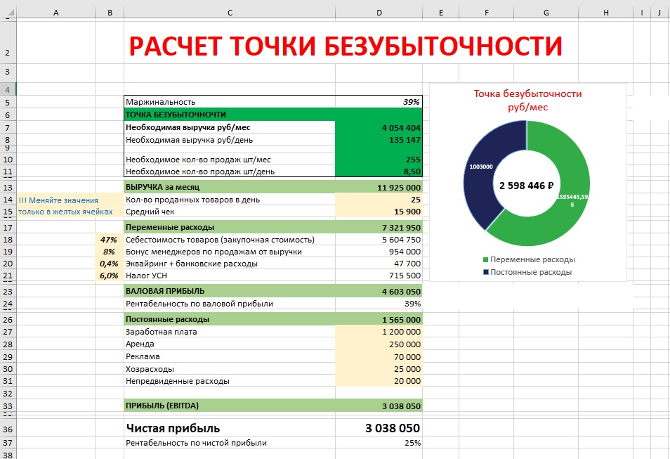 Шаблон «Точка безубыточности» в Excel сделает расчет за вас. Вносите данные только в желтые ячейки — всё остальное считается автоматически.