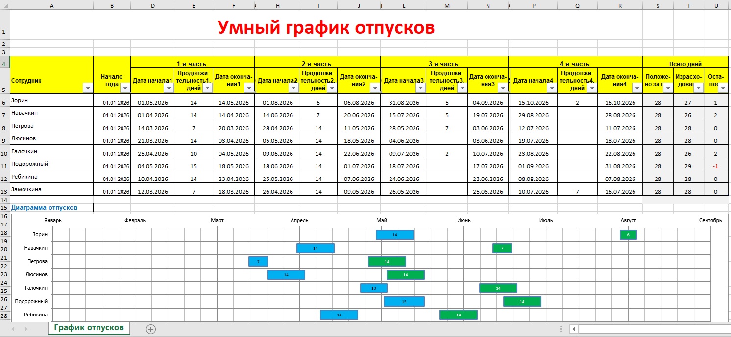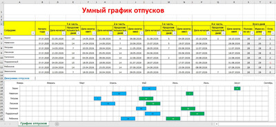 | Диаграмма Умный график отпусков - шаблон, таблица с формулами и примерами в формате Excel / Эксель, бесплатно скачать и распечатать
