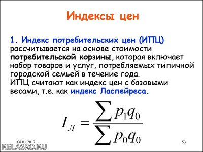 Индекс потребительских цен – один из основных показателей инфляции, значение которого отражает усредненные цены на услуги и товары в составе потребительской корзины за определенный временной период. При его расчете используется соотношение рыночной стоимости заранее избранного набора продуктов в текущем году к базовому. В России его анализом заведует государственная служба Росстат. Индекс потребительских цен по данной методике включает в качестве базового периода цену потребительской корзины в прошлом месяце. В январе используются данные за декабрь предыдущего года. Однако базис данного показателя может различаться в зависимости от страны.