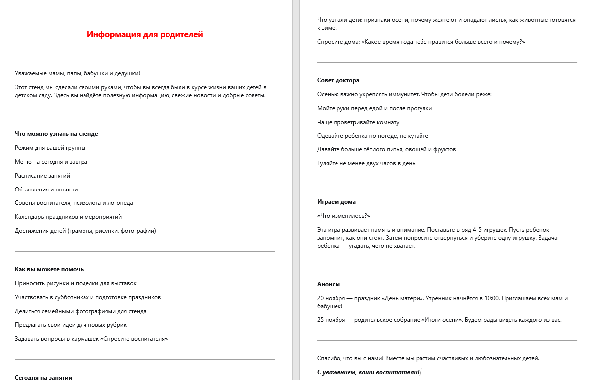 | Информация для родителей для стенда для Родителей в Детском саду своими руками - бесплатно скачать макет и бланки ДОУ с примерами Word / Ворд 2026 и распечатать А4