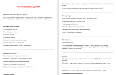 Почему это полезно Этот макет уже использовался в реальном детском саду и получил положительные отзывы от воспитателей. Текст написан понятным языком, без сложных терминов. Структура продумана так, чтобы родители быстро находили нужную информацию: советы по здоровью, тему занятий, домашние игры, анонсы.