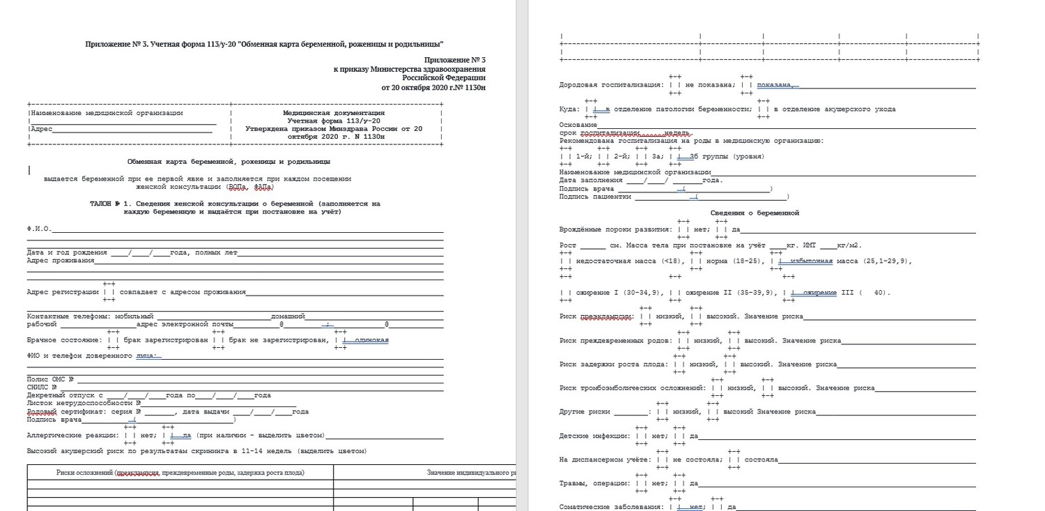 Актуальный шаблон обменной медицинской документации для беременных, рожениц и родильниц. Формат: Microsoft Word (.docx). Утвержден приказом Минздрава России от 20 октября 2020 г. № 1130н.