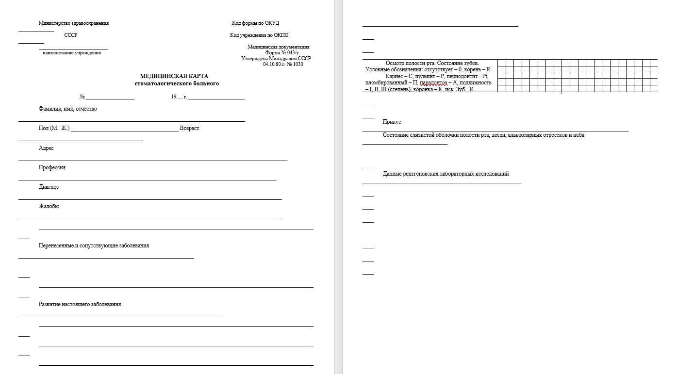 | Медицинская карта стоматологического больного. Медицинская документация. Учетная форма № 043/у - скачать бесплатно Word / Ворд 2026 и распечатать А4