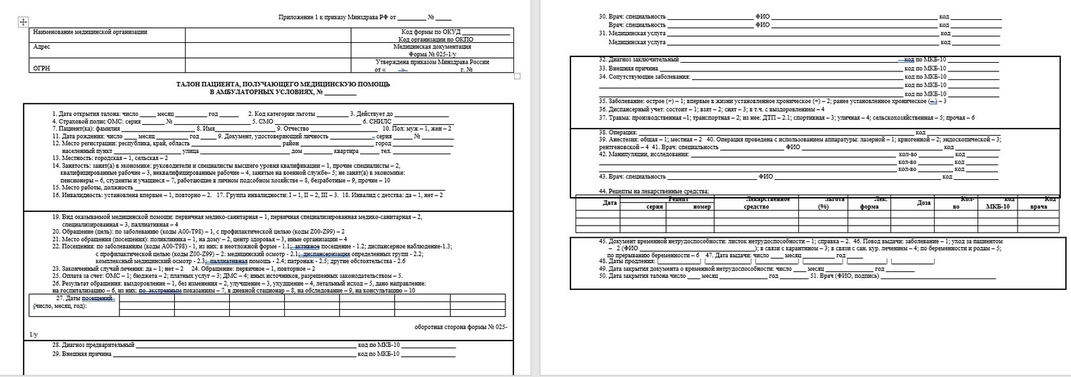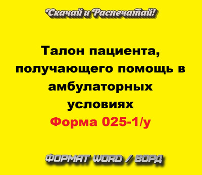 | Талон пациента, получающего помощь в амбулаторных условиях. Медицинская документация. Учетная форма № 025-1/у - бесплатно скачать в формате Word / Ворд 2026 и распечатать А4