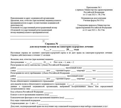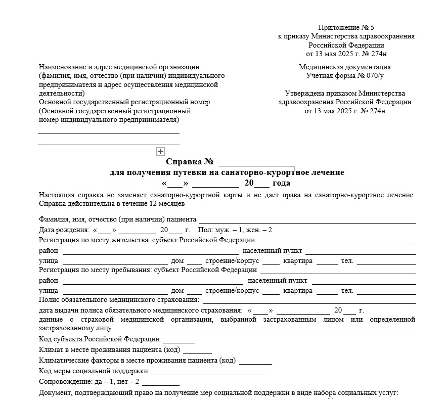 Актуальный бланк медицинской документации для направления пациентов на санаторно-курортное лечение. Формат: Microsoft Word (.docx). Утвержден приказом Минздрава России от 13 мая 2025 г. № 274н.