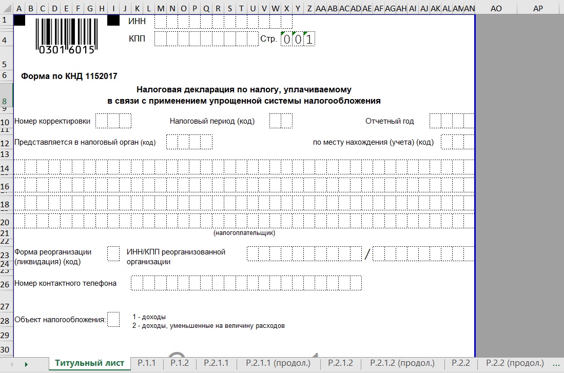 | Новый бланк налоговой декларации по УСН за 2025-2026 годы. Форма по КНД 1152017 скачать бесплатно бланк в формате Excel / Эксель 2026 и распечатать А4 доходы минус расходы без работников пример заполнения