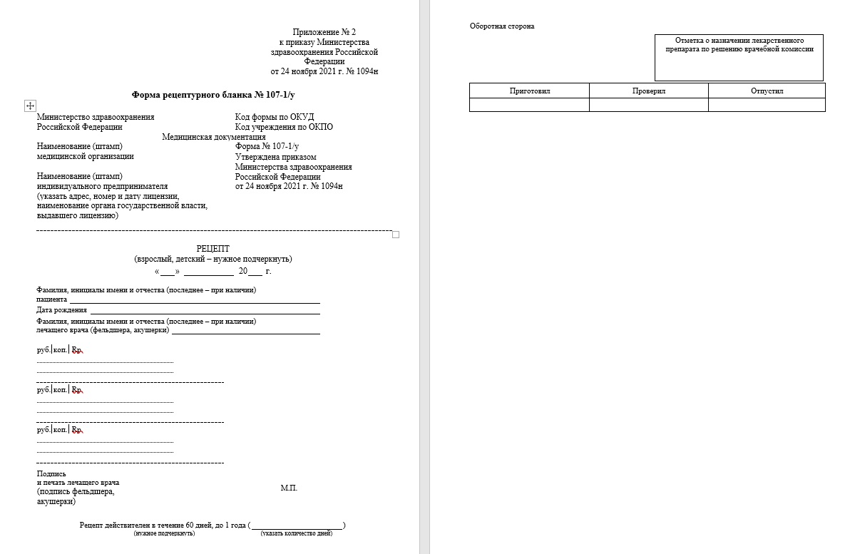| Бланк рецепта на лекарства. Форма 107-1/у. Медицинская документация - скачать бесплатно новый рецептурный бланк Word / Ворд 2026 и распечатать А4
