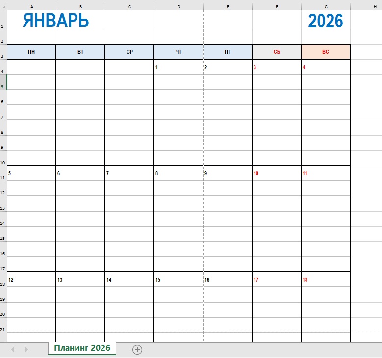 • Планинг на 2026 год - датированный шаблон, скачать Excel