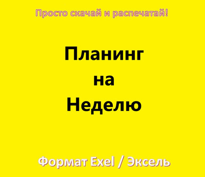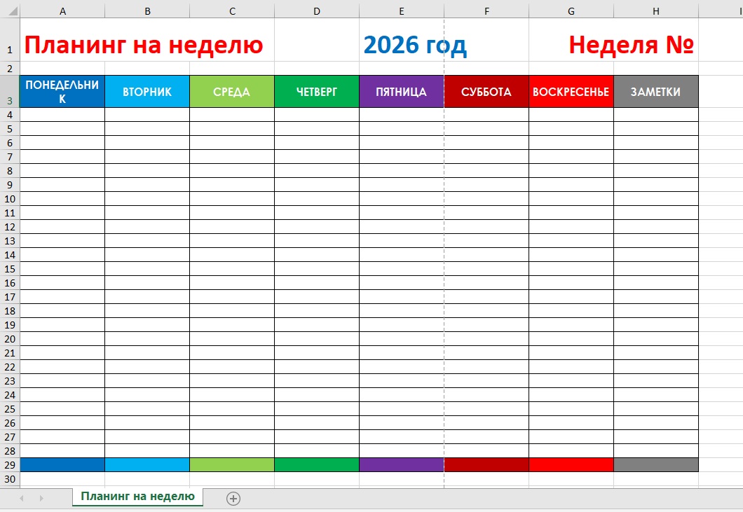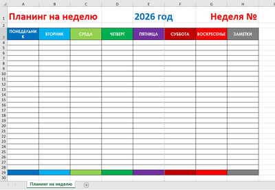 | Планинг на Неделю - шаблон таблица на каждый день в формате Excel / Эксель 2026, скачать и распечатать А4