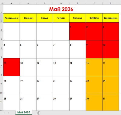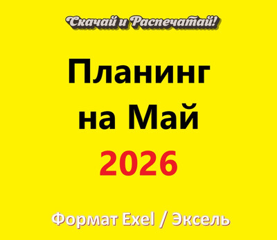 | Планинг на Май 2026 года - шаблон таблица на каждый день в формате Excel / Эксель 2026, бесплатно скачать и распечатать А4