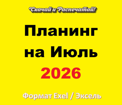 | Планинг на Июль 2026 года - шаблон таблица на каждый день в формате Excel / Эксель 2026, скачать и распечатать А4