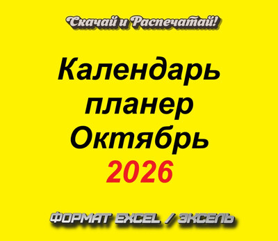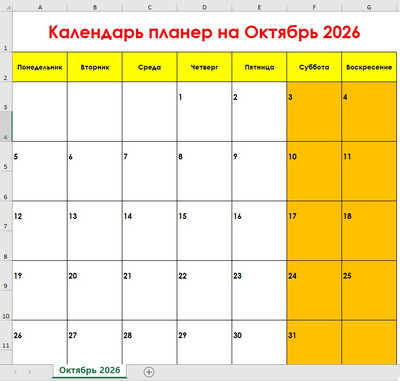 | Календарь планер на Октябрь 2026 года- шаблон таблица на каждый день, месяц по неделям в формате Excel / Эксель 2026, бесплатно скачать и распечатать А4