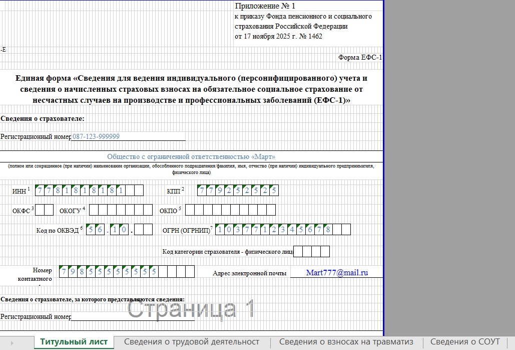 Ниже представлен актуальный бланк единой формы ЕФС-1 (Единая форма сведений для ведения индивидуального (персонифицированного) учета и сведений о начисленных страховых взносах на травматизм), утверждённый приказом СФР от 17.11.2025 № 1462, в формате, готовом для скачивания, заполнения в Excel / XLSX и печати на А4.