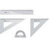 Набор состоит из 4 предметов: линейки 30 см, угольника 45°/16 см, угольника 60°/22 см, транспортира 180°/10 см.