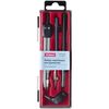 Набор в пластиковом пенале: циркуль, насадка с универсальным держателем, держатель рейсфедерной вставки, рейсфедерная вставка, карандаш и запасной грифель.