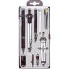Набор чертежных принадлежностей из 9-и предметов: циркуль из металлического сплава (длина 140 мм), запасной грифель, автоматический карандаш, запасные стержни для автокарандаша, крон-циркуль, рейсфедер, металлический держатель, точилка, рейсфедер с ручкой.