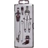 Набор чертежных принадлежностей из 5-и предметов: циркуль из металлического сплава (длина 135 мм), запасной грифель, крон-циркуль, насадка с универсальным держателем, металлическая ручка.