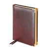 Ежедневник формата А5+ размер 145х216 мм. Классическая коричневая обложка из натуральной рециклированной кожи с тонкой фактурой может быть использована для тиснения логотипа. В отделке использован металлический декор: закругленные уголки, крашеные под золото. Их дополняет золотой обрез блока. По периметру проходит строчками нитками в тон обложке. Блок выполнен из бежевой бумаги плотностью 70 г/м2 и состоит из 208 листов (416 страниц). Первые 19 страниц отведены под справочные сведения, в конце на 28 страницах представлена телефонная книга и карта мира на вклейке. Быстро ориентироваться в записях помогут практичные закладки, выполненные из бордового шелка.