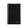 Вертикальная настольная визитница изготовлена из натуральной кожи черного цвета с тиснением под крокодиловую кожу, размер - 115x195 мм. Украшена прострочкой и золотистым металлическим шильдом. Рассчитана на 42 визитки. Каждый лист вмещает три визитки или банковские карты стандартного размера. Прозрачные карманы позволяют читать информацию, не вынимая карточки.