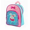 Рюкзак выполнен в восхитительном голубом цвете в сочетании с розовым в горошек. Рюкзак декорирован принтом, изображающим порхающую зайку-балерину в обрамлении сердечек, звездочек, и очаровательным темно-розовым бантиком, цвет которого повторяет цвет застегивающих молний рюкзака. Изделие качественное, легкое, удобное, яркое и красивое, понравится каждой девочке без исключения!
